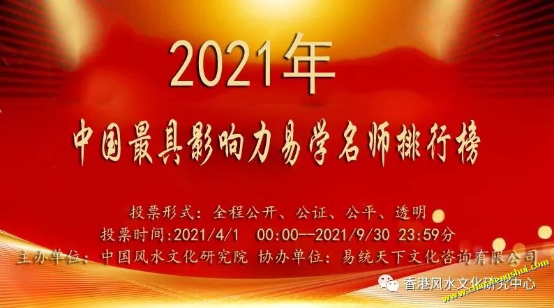 2021年度《中国最具影响力易学名师》评选活动,面向全球华人公开征集与投票。活动全程以公平、公开、透明、自愿的形式举行,为了您的利益,希望各位踊跃参与,以免错过此次的评选盛会!