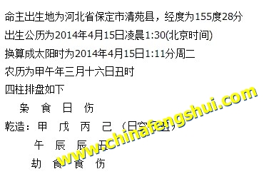 八字解析:以日干为太极点,生于辰月,不得月令,坐下辰土泄日干丙火之力,月干戌土 与时干己土也起到了泄丙火的作用,但戌土为燥土,号日主之力与己土相比相形见拙。日主三围皆为食伤土,从表象上看从食伤,然年柱甲木生午火,午火得一主气根,所以日主为身弱食伤旺的格局,综合五行能量大小,首取印星木生身制食伤为第一用神,此取比劫火为帮扶日主之用,官杀水 财星金为忌神。 五格三才配置分析: “王”笔画数为4画,天格五行所属为姓氏笔画数加1,等于5,五在数字里五行为土,天格是由祖上的姓氏所决定的,由不得自己选择,故而对名字的吉凶影响不大,关键看祖上是否积德行善,从而产生阴注阳受的作用。 根据命主四柱命局的喜忌,“天地人”三才配置的最佳格局为”土火木,考虑到人格不受伤的原则,为木生火,火生土,火起到通关的作用,代表相生有情,愿望能平安实现,成功发展,基础稳固,可得幸福长寿的配置 姓名寓意及备选名: 以土火木的三才配置,在综合命主的用神,名字的第一个字以“俊为最佳,俊的笔画数为9画,人格五行为火,符合命主的用神,另外,俊代表英敏之才,上下敦睦,中年成功隆昌,出外吉祥,名利双收之寓意,名字的第二个字为”笙“,五行为木,和命主的用神也即为吻合,地格五行为木,格局也符合名字的用神。 第二个名字“皓”的五行也为木,代表智勇双全,清雅荣贵,官运旺,妻贤子孝,成功隆昌之寓意,地格数21画,五行也属木,符合命主用神。 “筌”多才伶俐,福禄双收,中年吉祥,子孙兴旺,晚年隆昌之含义,“筌”的笔画数为12画,地格数为21画,也符合命主的用神。 综合以上分析,命主的天地人三格三才配置,再结合命主的用神,最佳用名为 王俊笙 王俊皓 王俊筌 最后恭祝王家二公子 福泽深厚身体棒 幸福常在永安康 清雅脱俗成栋梁 光宗耀祖美名扬 |